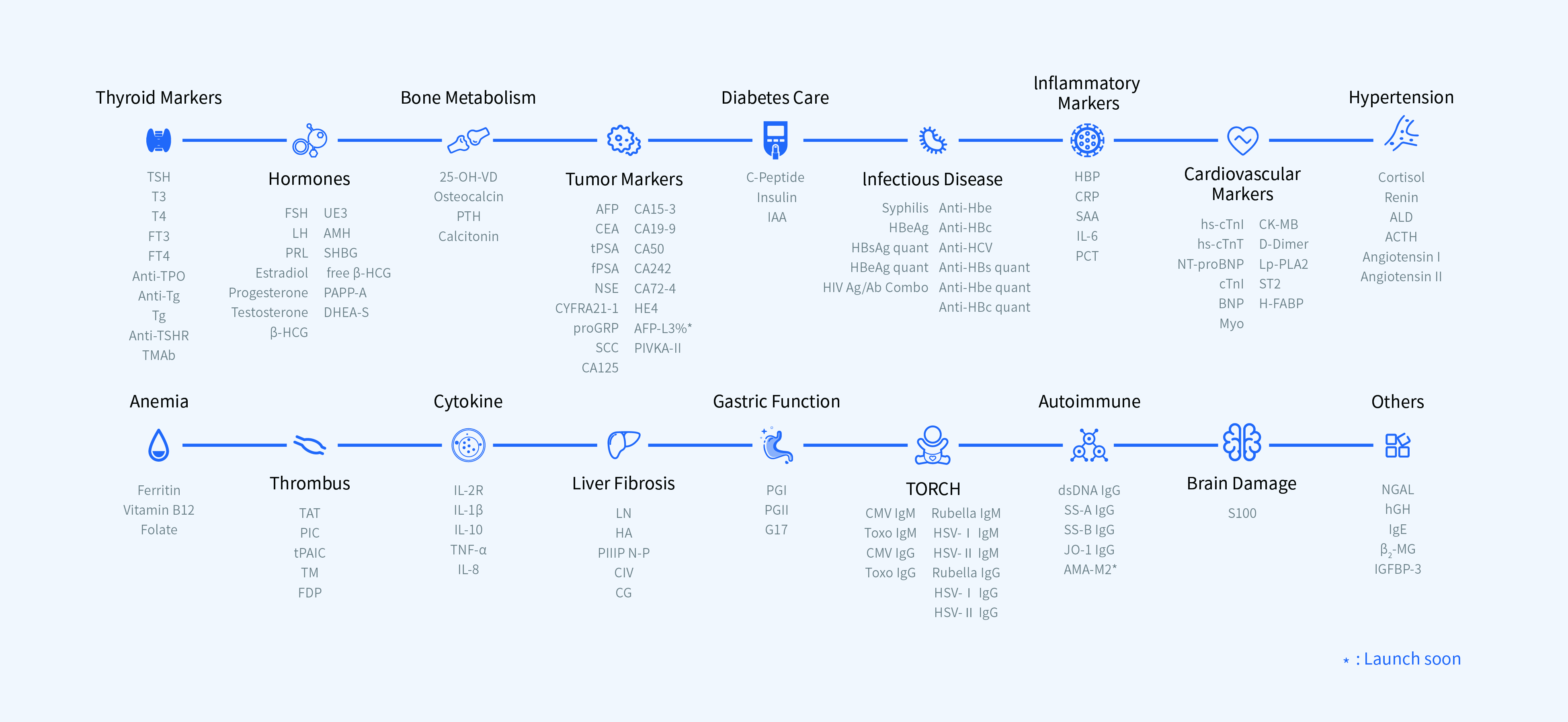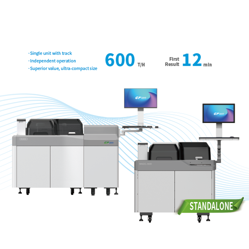 Para laboratórios com alta demanda de testes, o MAGICL 8500 se destaca como a escolha perfeita, graças à sua alta capacidade de processamento de 600 testes por hora. Além disso, oferece excelente custo-benefício e um formato ultracompacto. Seu design flexível e escalável permite a fácil integração de múltiplas unidades de pré-analítica, química clínica e imunoquímica, atendendo às necessidades de laboratórios de maior porte.